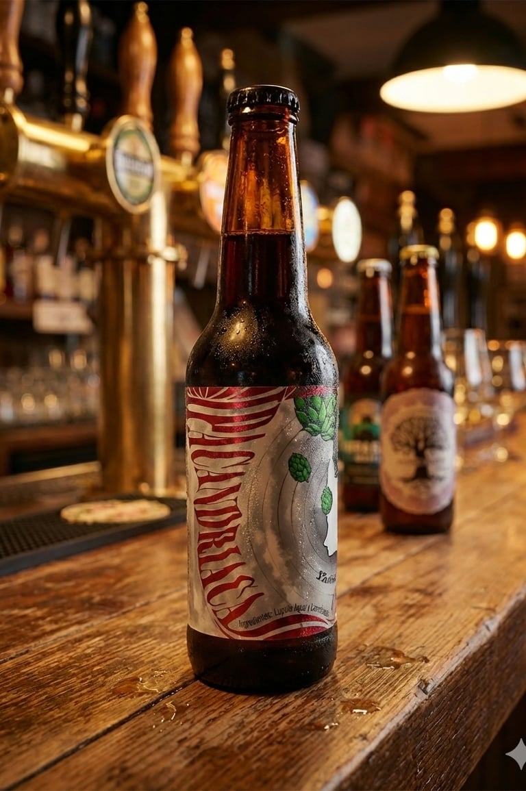 Frase: de las profundidades del amargo abismo surge esta refrescante creación para los verdaderos amantes del lúpulo, que se obsesionan con el grado de IBUS.